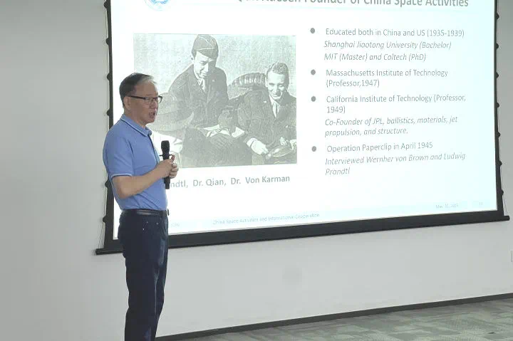 在专题报告环节,联合国附属空间科技教育亚太区域中心(中国)首席科学家、国际宇航科学院院士孙功凌教授以“中国航天发展与国际合作”为题,向学生讲述了中国与拉美航天合作案例,展望未来发展前景。