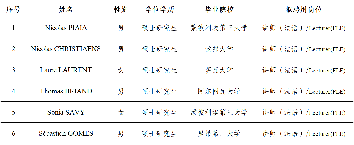 根据国新院招聘公告及相关要求,经公开报名、综合考察及国新院审定,拟编外聘用Nicolas PIAIA等6位人员,现将拟聘用人员的情况公示如下: