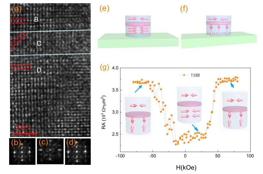 研究团队使用国产单原子层级精度超高真空磁控溅射系统,制备了高质量的RuO₂单晶薄膜,发现在RuO₂中不仅存在反铁磁性,而且存在由于spin-flop现象导致的隧穿磁电阻效应。而且隧穿磁电阻效应可能和晶体对称性相关,导致了各向异性的磁电阻效应。这项工作有利于我们深入了解RuO₂体系的磁性特征,实现高达60%的磁信号高效读取,为高可靠、高性能磁存储器等新型后摩尔时代集成电路器件研制奠定基础。