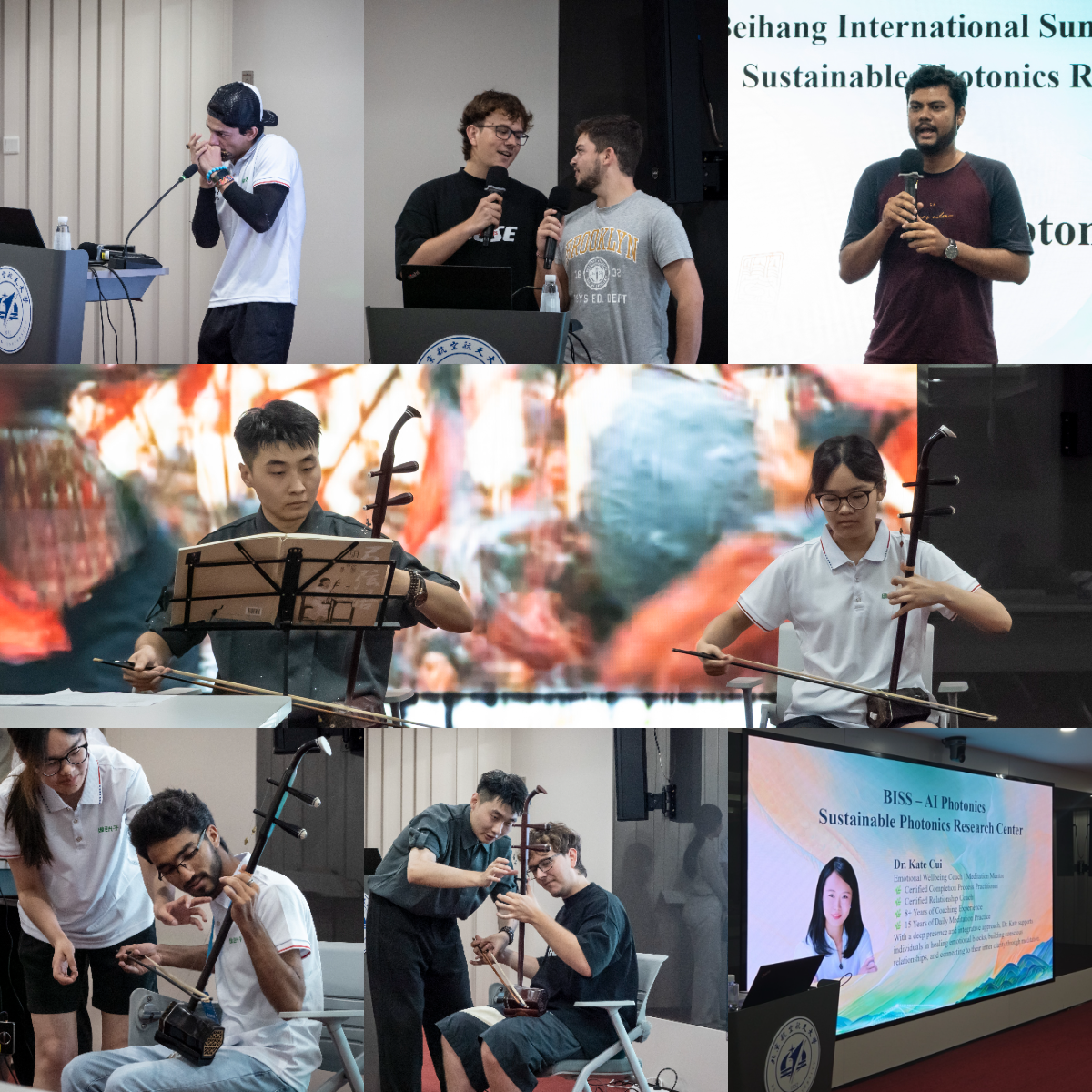 在学术探索之余,本届暑校还精心策划了丰富多彩的文娱活动,构建起多元开放的国际文化交流平台,让学员们在欢笑与合作中缔结真挚友谊。每日傍晚,学员们或在篮球场上挥洒汗水,释放青春活力;或在排球场上默契协作,展现团队精神;又或在绿茵草地间畅玩飞盘,感受运动的激情与快乐。17日下午的才艺展示环节精彩纷呈,悠扬的二胡、清越的笛声、欢快的口琴以及热情奔放的西班牙歌曲轮番上演,共同奏响了一曲跨越文化与国界的青春交响。在24日上午举办正念冥想工作坊中,随着意念引导师的指引,学员们通过呼吸调节技巧和感官聚焦训练,在宁静中感受专注与觉察的力量。