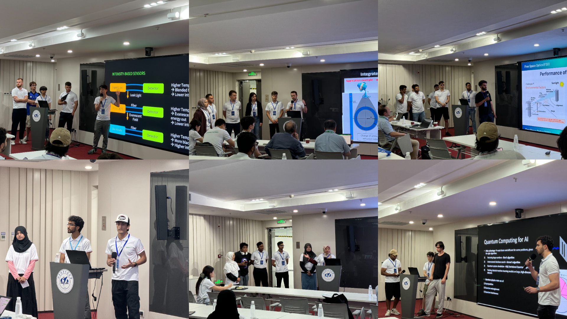 在学术汇报环节,学员们分为六个研究小组,围绕AI Photonics前沿课题展开深度探讨。第一小组聚焦光纤温度传感技术,创新性地探讨了Agentic AI在数据处理中的应用潜力;第二小组系统性地梳理了集成光子学芯片在环境监测领域的最新研究进展与应用前景;第三小组对自由空间光通信(FSO)与可见光通信(VLC)技术进行了全面比较研究,重点学习了大湍流补偿算法和空间分集接收技术;第四小组详细汇报了光子计算技术在缓解AI能耗危机方面的突破性进展,分析对比了光子芯片与传统电子芯片的性能优势;第五小组探讨了AI-光子结构监测系统,深入研究了分布式光纤传感技术与LSTM算法在基础设施健康监测中的协同应用;第六小组深入量子光学领域,系统阐释了频率纠缠光子源的制备原理,并前瞻性地探讨了其在量子通信中的应用前景。这些高质量的学术汇报不仅展现了学员们对AI Photonics交叉学科领域的深刻理解,更体现了暑期学校在培养复合型创新型人才方面取得的卓越成效。